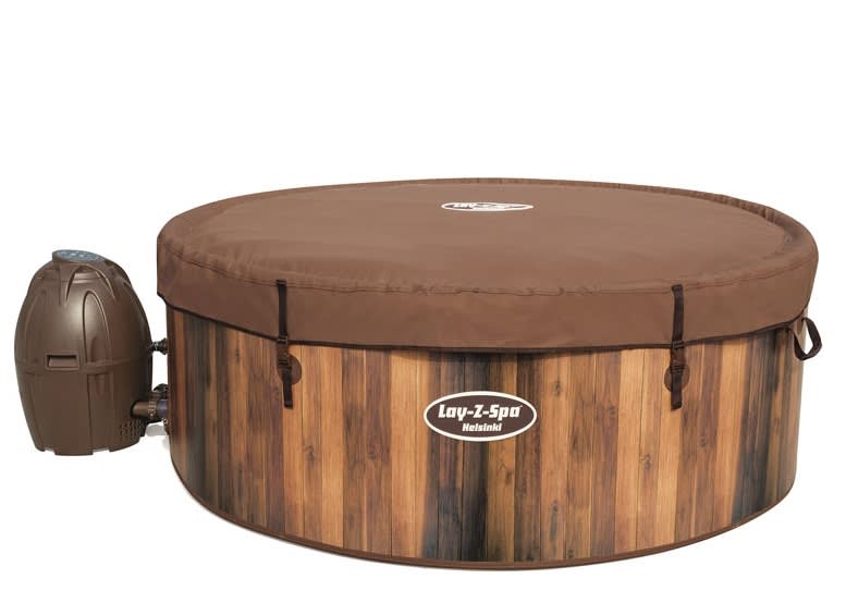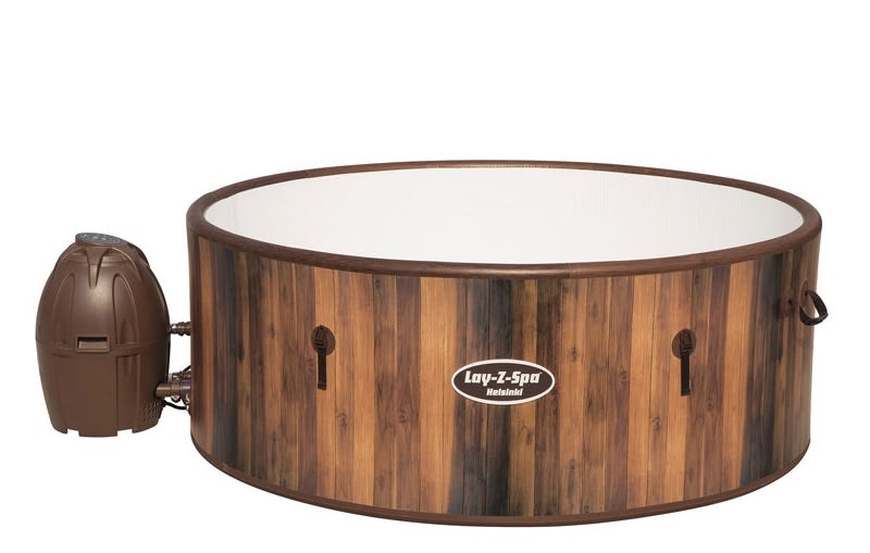 Finished in an authentic Scandinavian wood effect, to look just like a permanent hard ridged hot tub, the Helsinki is 1.8 metres across and holds over 1100 Litres of water. That makes it large enough for up to Eight people at once, or a spacious treat for just the two of you to stretch out and relax together.